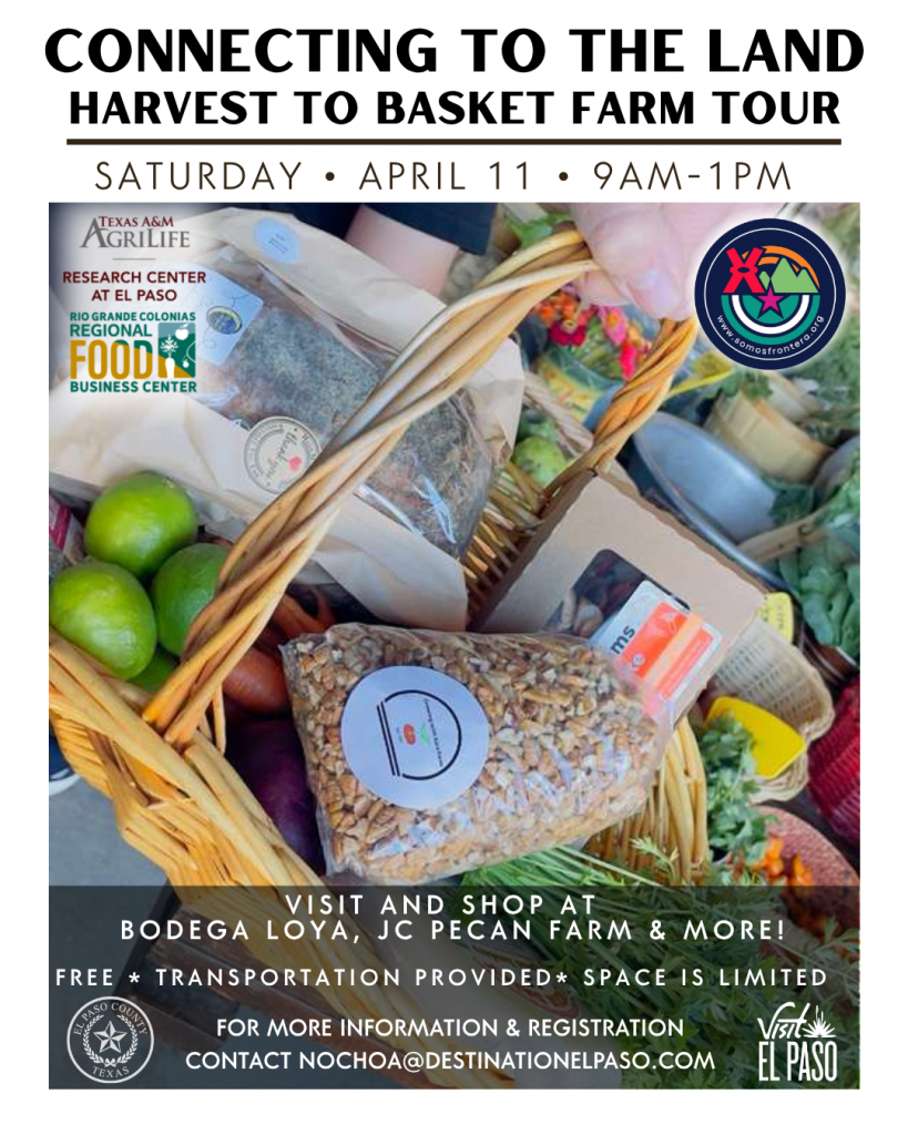 Harvest to Basket Farm Tour Saturday, April 11, 2026 | 9:00 a.m. to 1:00 p.m. Meeting Location: Bodega Loya, 10257 Socorro Rd., Socorro, TX 79927 The event is free, but space is limited. Transportation from Downtown to Bodega Loya is available for those coming from West El Paso. For more information, contact nochoa@destinationelpaso.com.